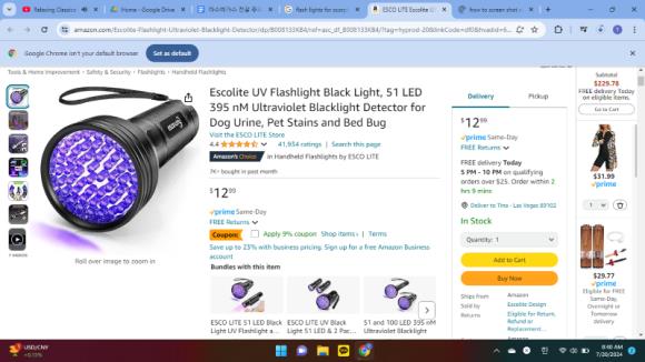 페스트 컨트롤을 부르기 부담된다면 아마존이나 홈디포, 월마트에서 특수 플래시를 사면 된다. 말이 특수이지 10불 안팎이다. 그걸로 집 주위나 마당 등을 비추면 짜잔~~ 하고 전갈이 나타날 것이다. 용기 있는 사람은 바로 죽이면 되고 그게 무섭다면 약을 뿌리는 방법도 있다. 나는 그냥 페스트 컨트롤 불렀음. 무서워서.